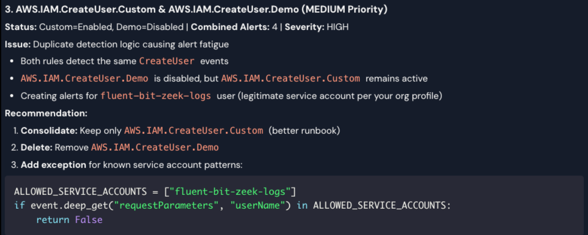 这个代理显示,大多数规则似乎都是合法的管理操作,这是一个很好的观察,并创造了调整的坚实候选者。其中一条具体的反馈是识别出一个冗余规则,该规则导致了重复警报并增加了团队的工作量: