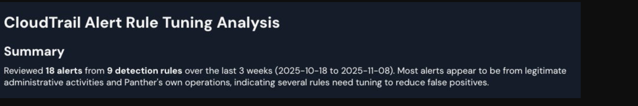 用 AI 代理自动化这个过程会是什么样子?它需要访问检测逻辑,审查创建的警报,查询日志数据,然后提交工单。让我们通过 Panther 的 AI 助手来演示这个过程:
