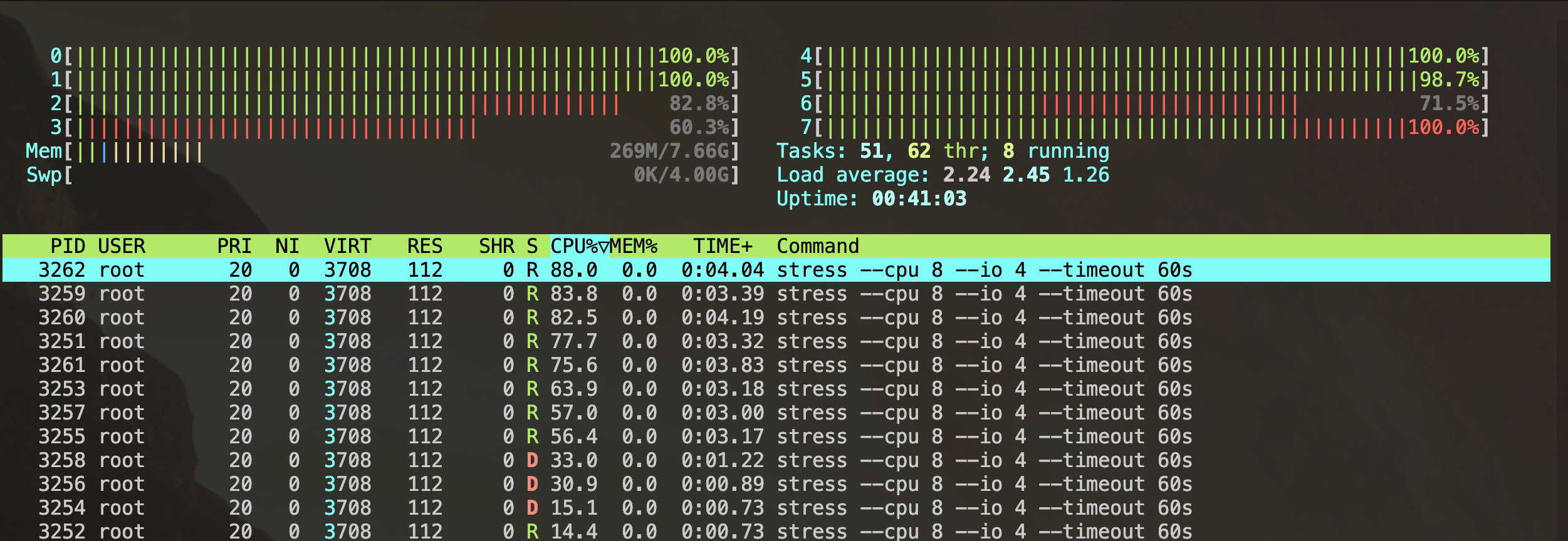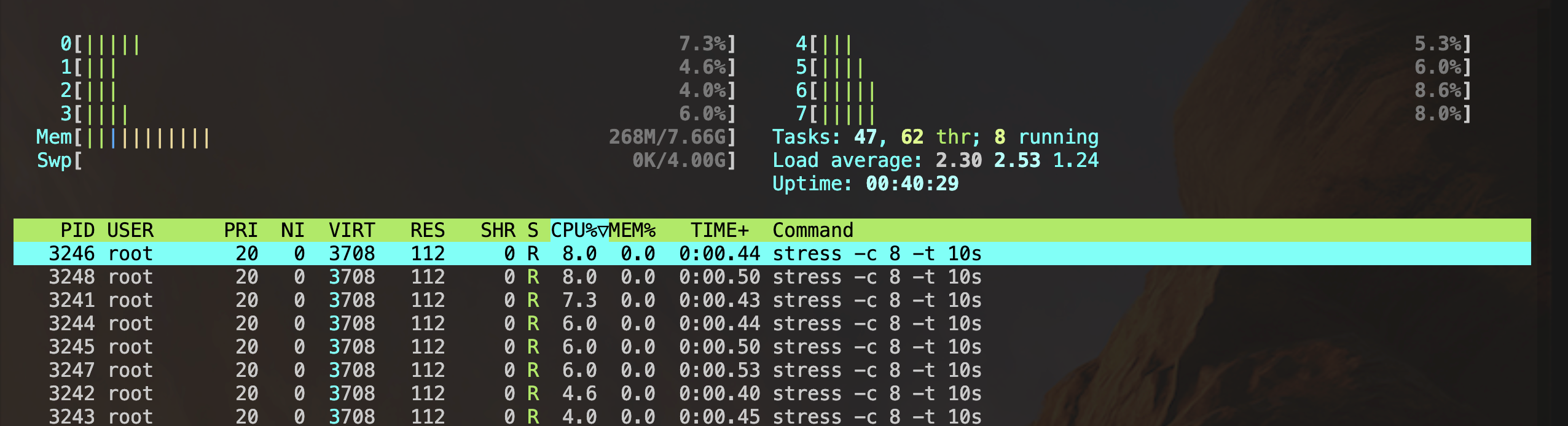sudo cgexec -g cpu:test stress -c 8 -t 10s限制后: