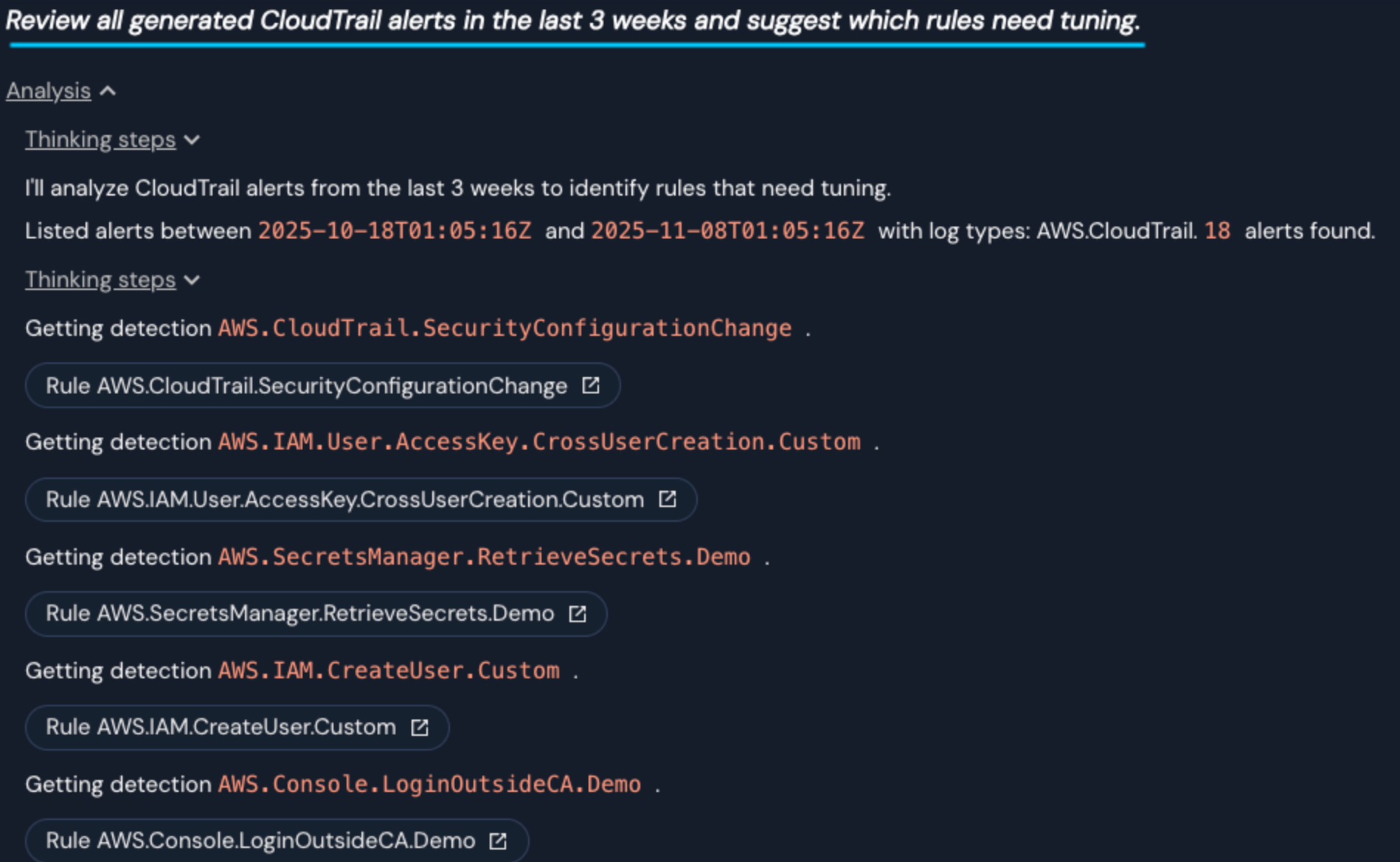 让我们分析一下这里发生了什么。用户询问关于调整过去三周 CloudTrail 警报的问题。代理调用工具列出该时间段的警报,发现 18 个警报,然后获取每个检测规则以了解这些警报的来源原因。一旦它获取了这些外部信息,它就会推理哪些规则需要调整,哪些规则运行正常,并生成分析报告,说明如何生成更少或更准确的警报。