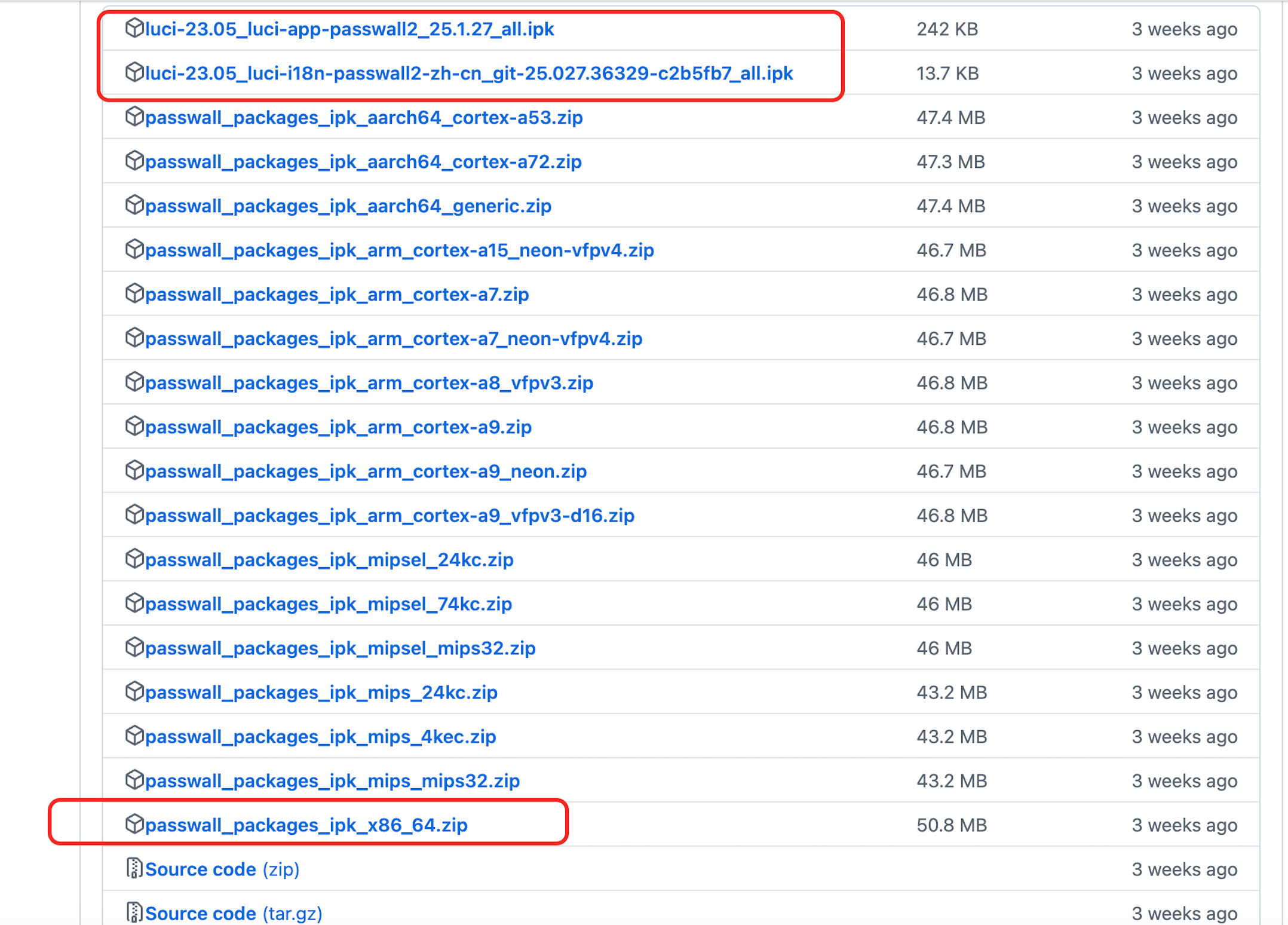 opkg install dnsmasq将上面的下载的3个安装包进行整理,解压passwall_packages_ipk_x86_64.zip文件,将该zip文件的所有文件提取出来,让所有的ipk包都在同一级目录下,如下: