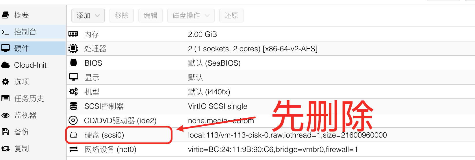 在pve中构建openwrt的虚拟机,构建完成后删除硬盘,如下