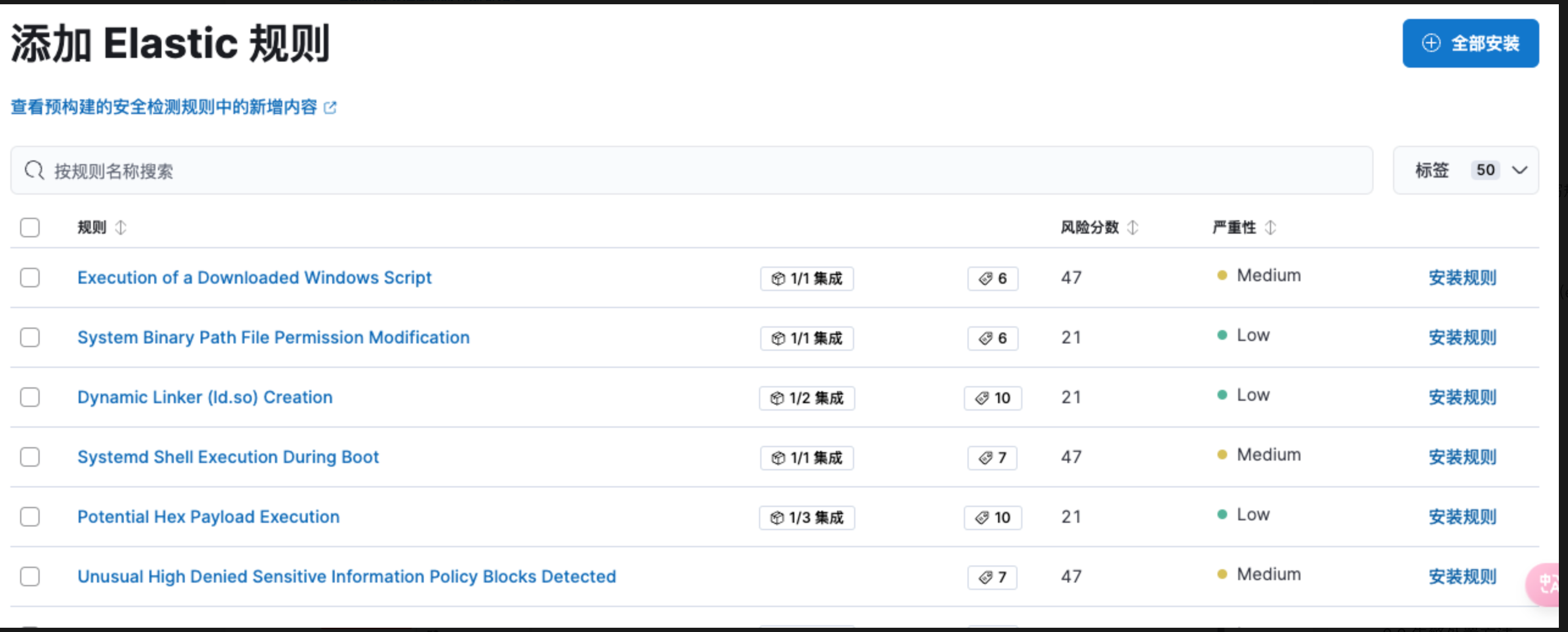 https://epr.elastic.co/epr/security_detection_engine/security_detection_engine-8.15.17.zip),获取最新的规则集安装包。更新规则集:将规则集安装包放到