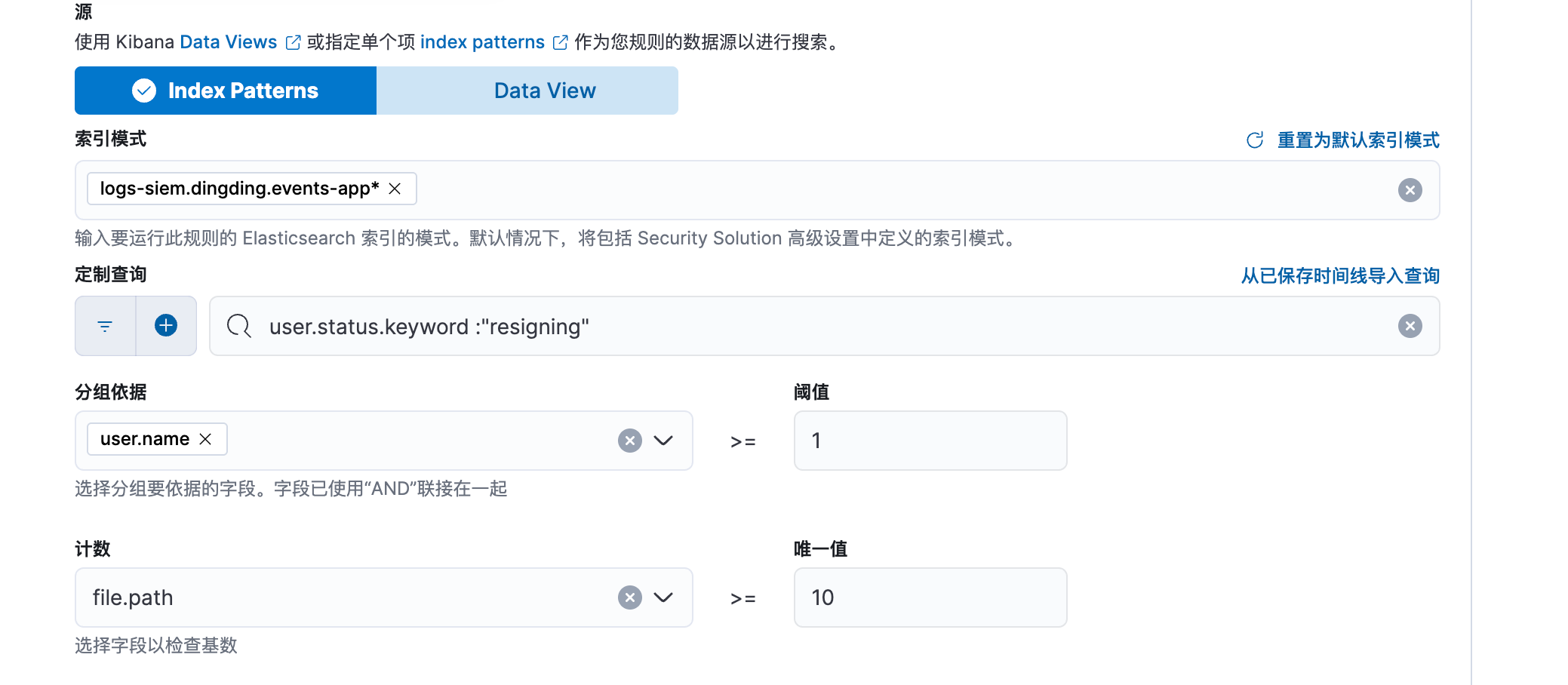 如当钉钉代离职人员操作文件数量大于10的时候,告警