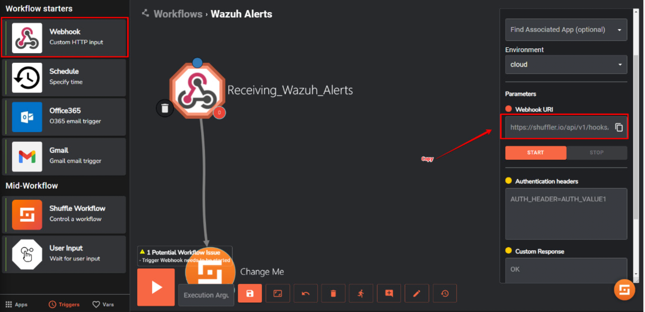获取该webhook的url连接, 通过配置wazuh server ,将满足该工作流的告警发送到soar平台中,进行后续编排